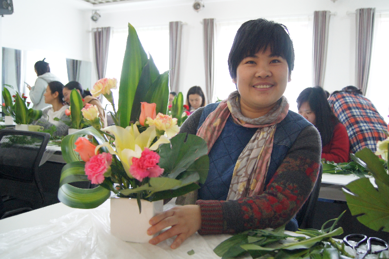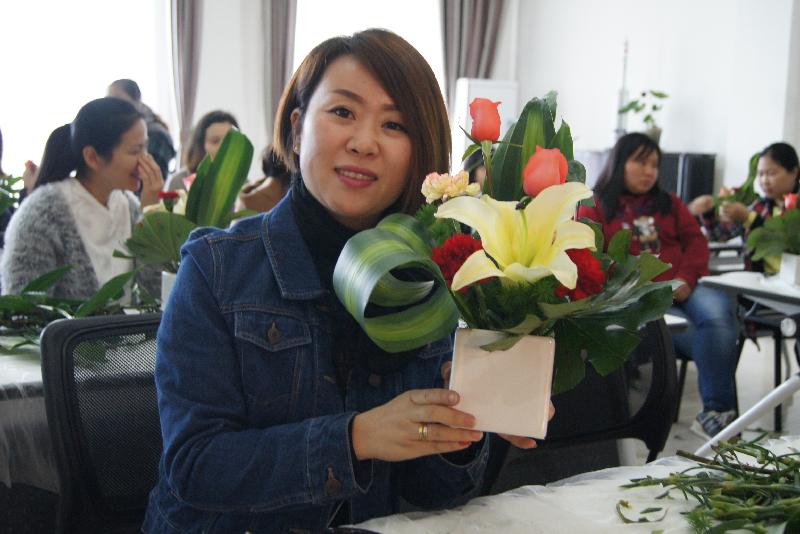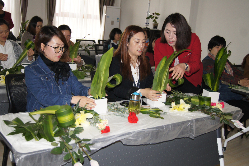 活动邀请了专业花艺老师为大家培训。从插花工具开始,介绍了花材、叶材的修剪处理;插花基本结构和基本造型技法。老师们在花艺师的指导下,经过一个多小时的创作,一盆盆灿烂缤纷、新颖别致的插花作品“新鲜出炉”了。看着一盆盆美丽的鲜花出炉,教师们笑靥如花。