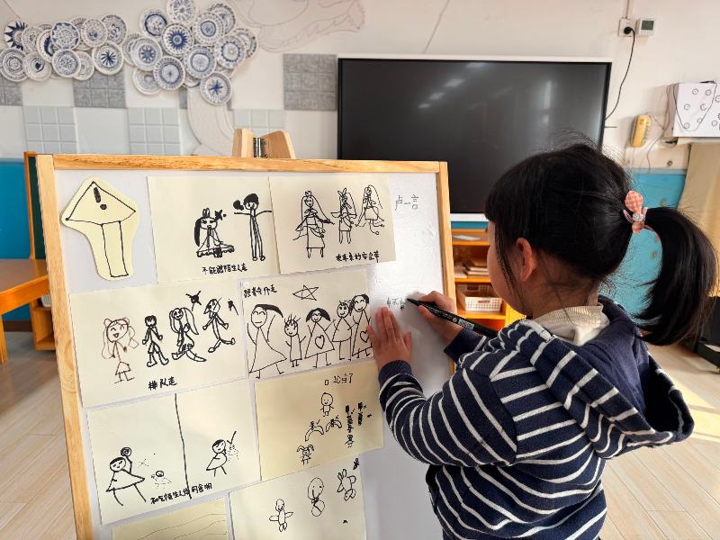 我们化身“小小讲解员”,向同伴讲述自己的发现与收获。我们将精心制作的银杏叶作品与古桥的故事,分享给苗苗班的弟弟妹妹们。同时,我们也用画笔续写旅程,让金泽的秋韵在故事中延续生长。