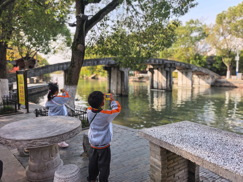 小手拉着大手,沿着石板路缓缓而行。万安桥、普济桥、迎祥桥……每一座古桥都有一个故事。我们仰头看桥拱,俯身摸石纹,相机定格瞬间,画笔记录所见。“迎祥桥为什么没有栏杆呢?”“木头造的普庆桥结实吗?”“为什么古桥的桥洞数量不一样呢?”“这些古桥是什么时候建造的呢?”我们揣着满脑子的小疑问,点着豆包问、拉着路过的爷爷奶奶问,这一路的好奇探索,都变成了最可贵的成长经历。