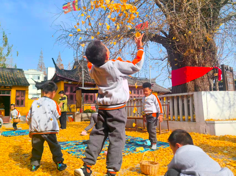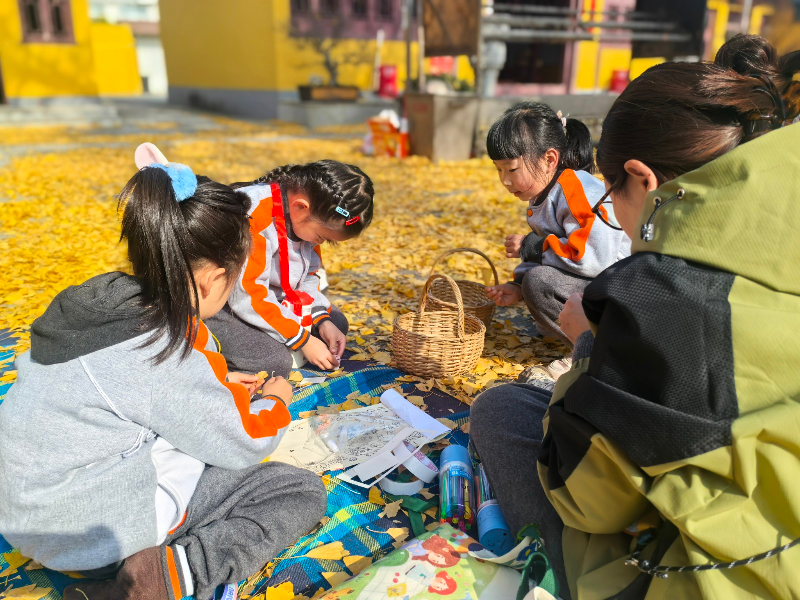 走进颐浩禅寺,千年银杏洒落满地金黄。我们拾起一捧银杏,仰面向着天空轻轻扬起。涂鸦、贴画、测量、记录——自然成为最生动的课堂。“我的银杏叶像爱心!”“树干好粗,感觉要几个人才能抱住!”欢声笑语中,秋天在掌心绽放。