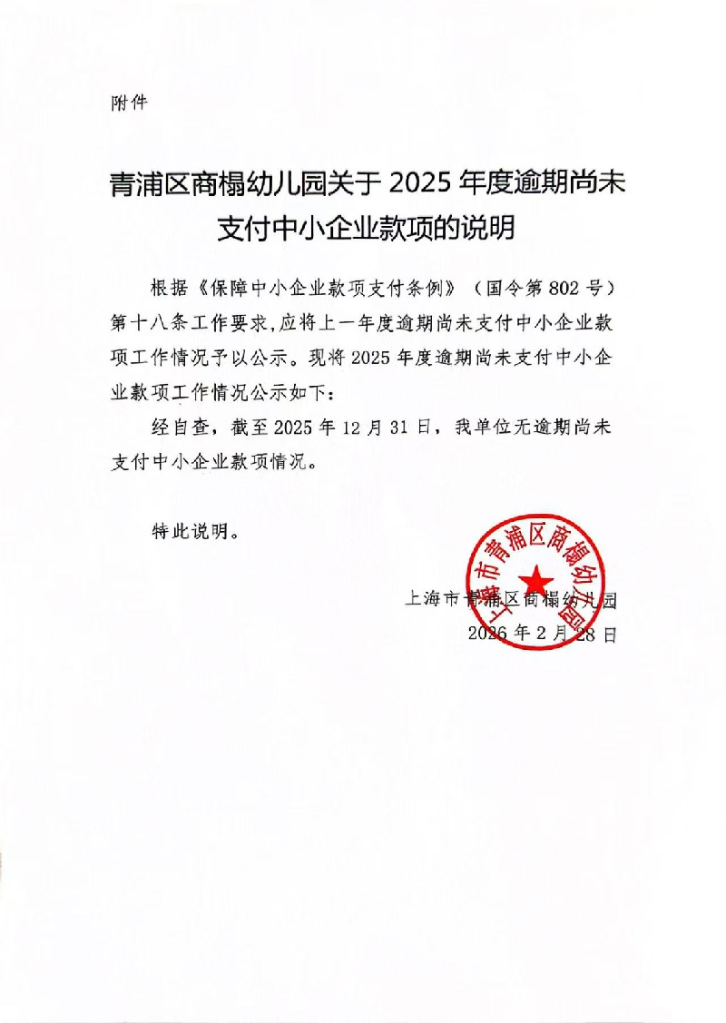 青浦区商榻幼儿园关于2025年度逾期尚未支付中小企业款项的说明